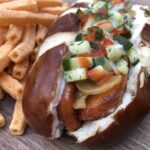 - Creamy and Savory – Vegan cream cheese and pretzel buns are a perfect match.