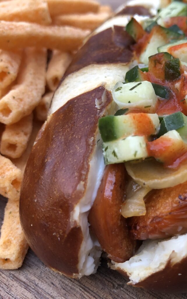 Lightlife Jumbo Smart Dogs bring the classic snap, Oatly Original Cream Cheese adds rich creaminess, and Pretzilla Pretzel Sausage Buns hold everything together beautifully. Finished with sautéed onions, a crunchy cucumber relish, and a little sriracha heat, this is a fun, satisfying snack or lunch that shows just how far vegan food has come.